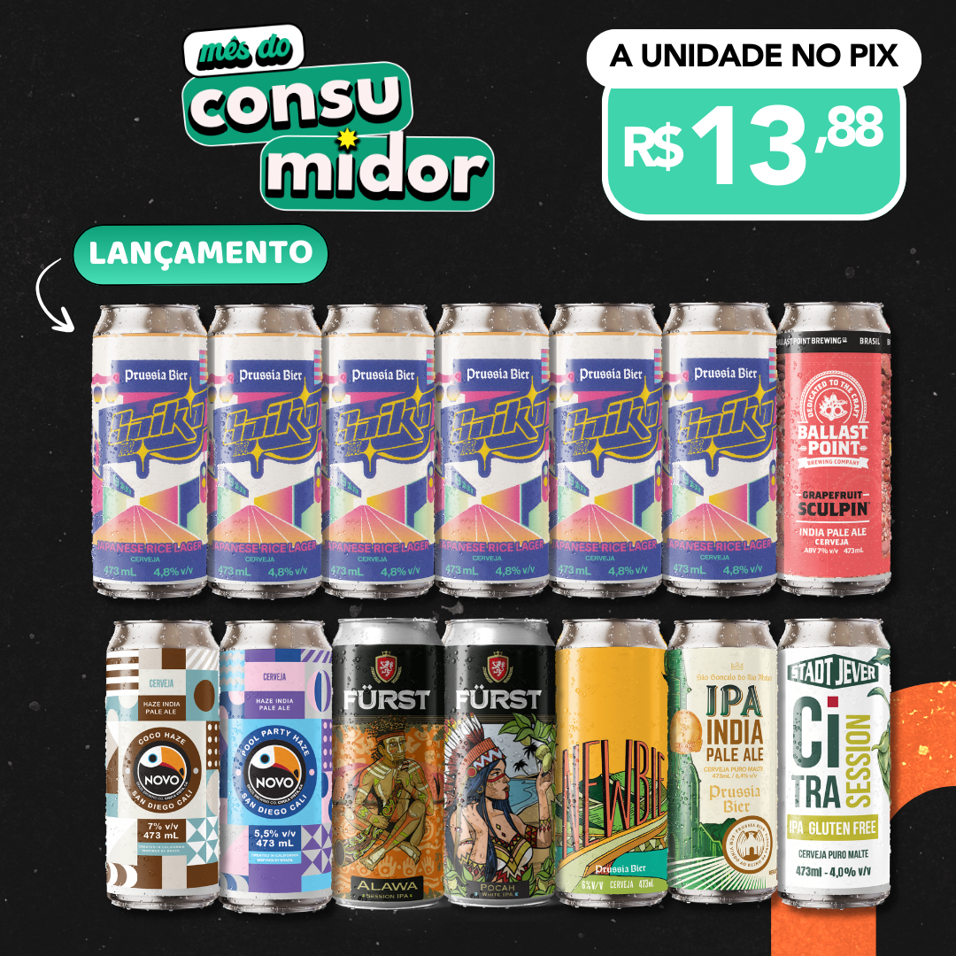 O Saiko + IPAs é um combo de IPAs com o lançamento do mês de março, a Saiko Rice Lager! São 6 unidades da Saiko, refrescante, superdry e fácil de beber, acompanhadas por uma seleção de IPAs que exploram diferentes perfis — da Session mais leve e aromática à English IPA clássica, passando por NEIPA, Hazy com coco e rótulos com toque cítrico como a Sculpin Grapefruit. O mix ainda inclui estilos que ampliam a experiência, como Pils e White, criando um conjunto versátil para quem aprecia lúpulo, frescor e variedade no mesmo pacote. Algumas cervejas são frescas e não pasteurizadas, por isso é importante mantê-las refrigeradas após o recebimento para preservar suas características.